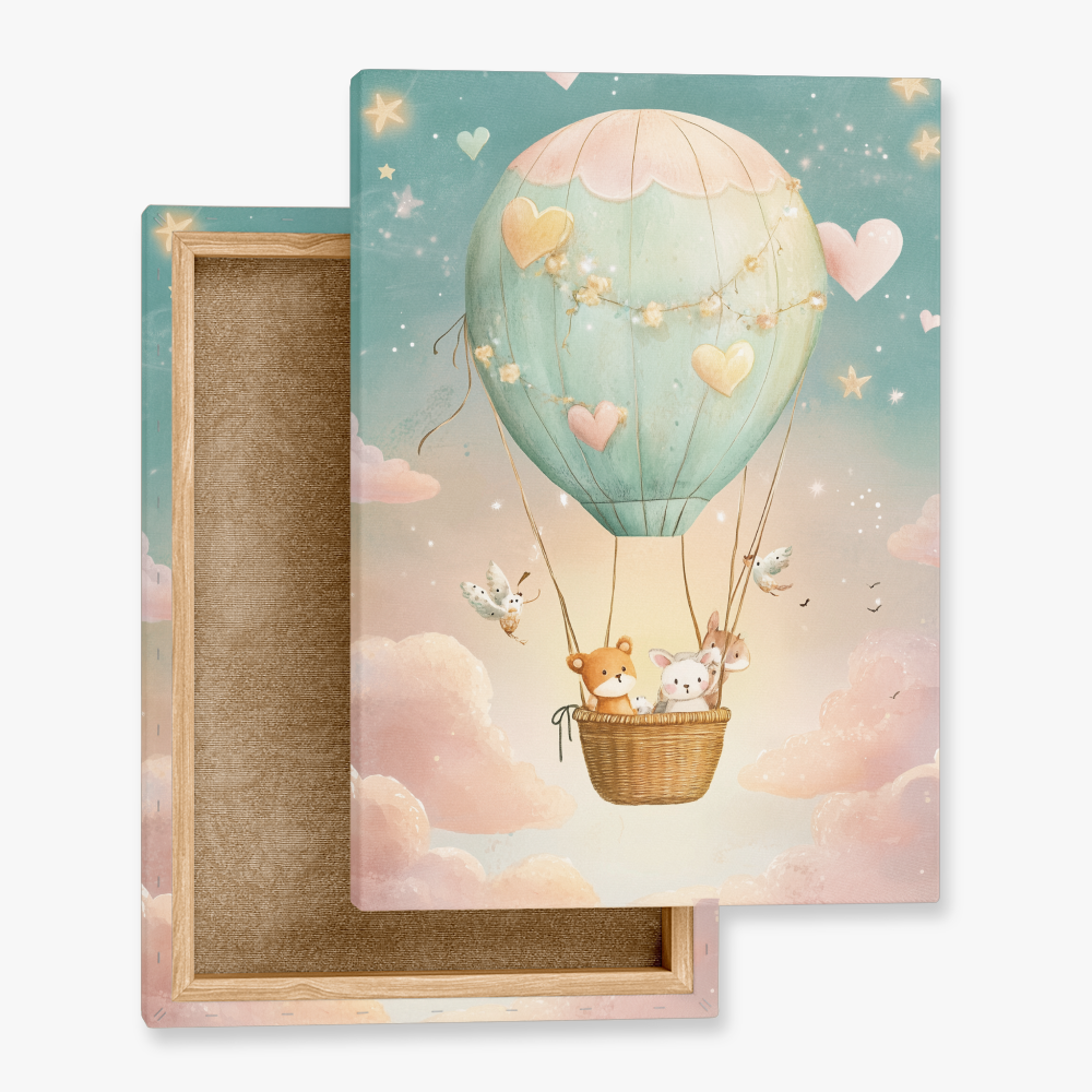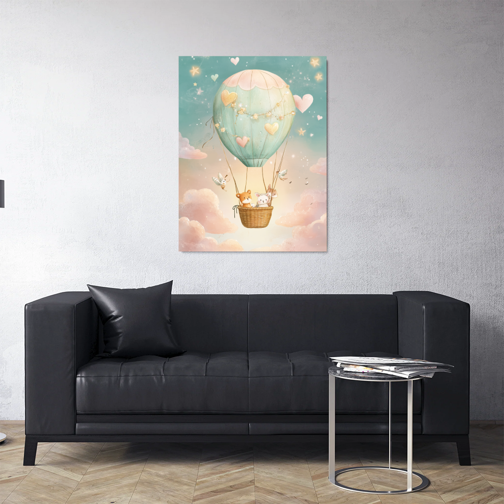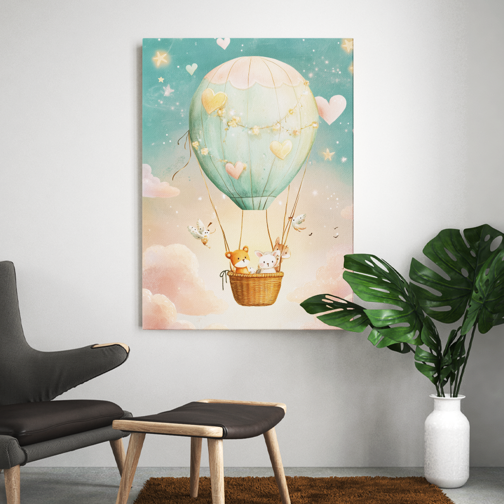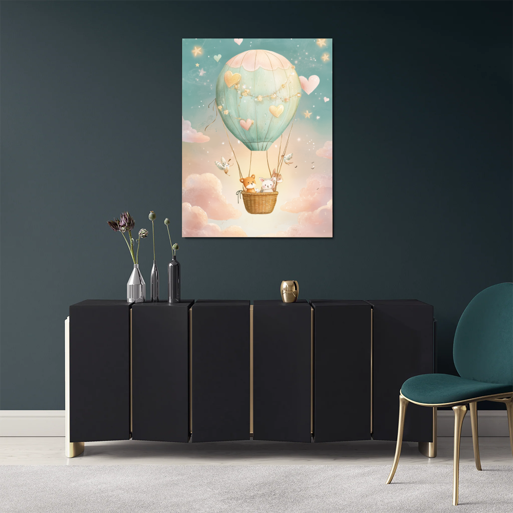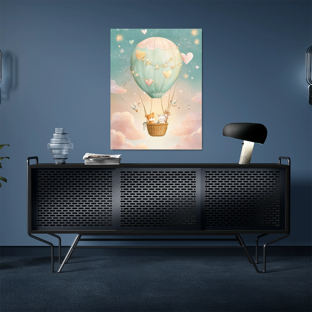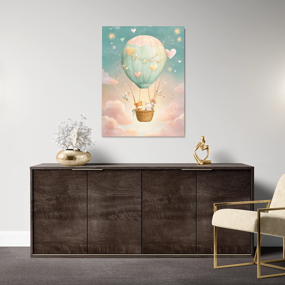 Le Tableau Déco Chambre Bébé Original qui transforme l'espace en cocon féerique avec sa montgolfière enchantée et ses adorables compagnons.