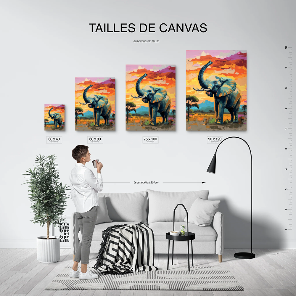 Le Tableau Eléphant Trompe en L'air transforme votre espace avec sa palette vibrante et sa majesté saisissante.